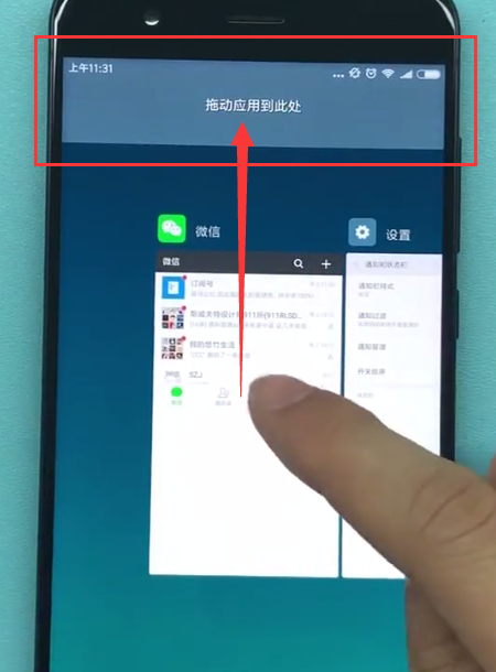 3、按照提示选择需要分屏的应用拖动到手机屏幕上方,