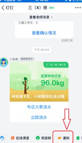 第二步:打开钉钉,进入到班级群,再点击“通知”,如下图所示。