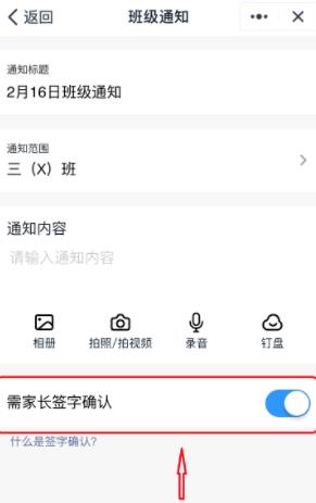 第五步:然后在发布通知时将“需家长签字确认”后面的开关按钮打开即可,如下图所示。