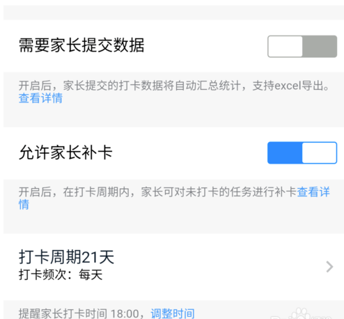4.再就是可以点击打开【允许家长补卡】选项,在打卡周期内对未打卡的任务进行补卡。