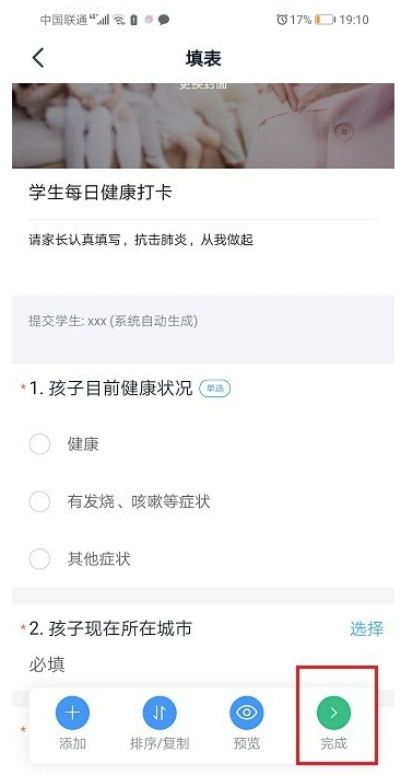 第三步进去学生每日健康打卡界面,可以设置打卡内容,点击完成,如下图所示: