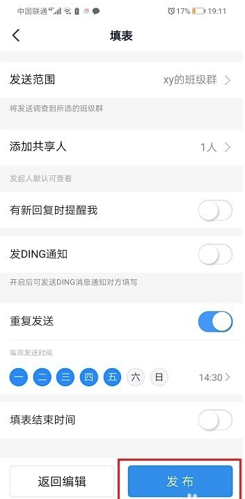 第四步进去之后,选择打卡的学生和重复要求打卡,点击发布,如下图所示: