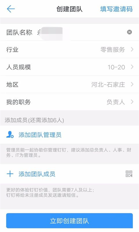 2.在创建团队界面中输入团队信息,之后点击下方立即创建团队。