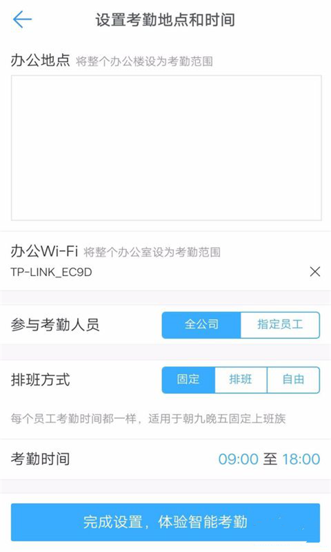 5.在设置界面输入办公地点、排班方式等信息,点击完成设置。