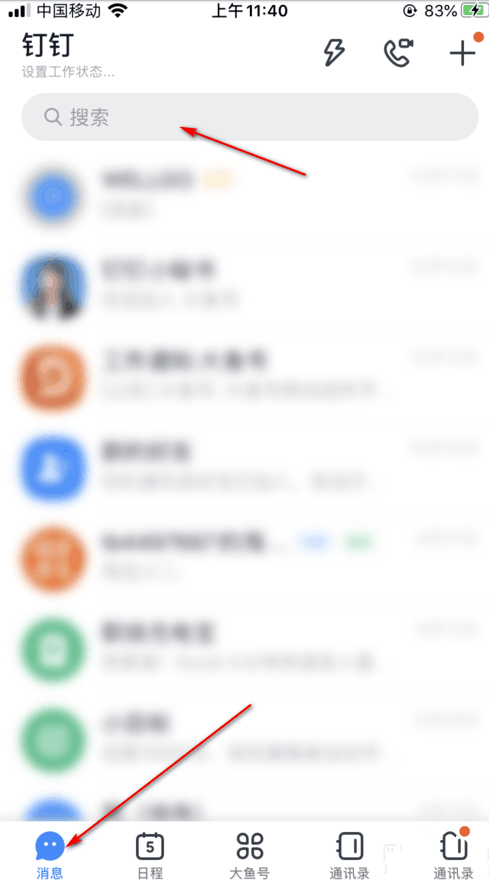 1.打开钉钉,进入首页,点击上方的【搜索框】。