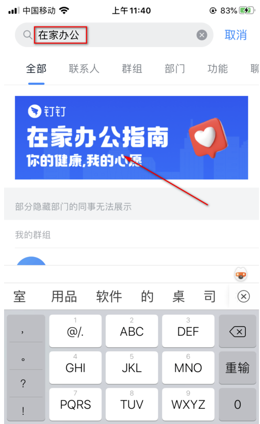 2.然后在里面输入【在家办公】四个字,再点击结果里的第一个即可进入。