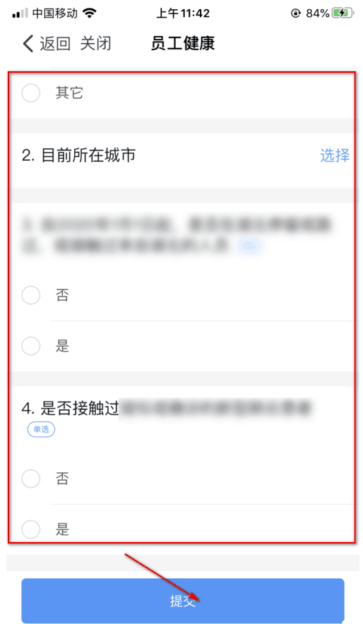 9.按照自己的实际情况进行填写,最后点击【提交】按钮即可完成健康打卡。