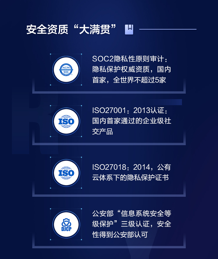 对于钉钉受到市场青睐的原因,无招强调对安全隐私的保护能力是钉钉的一大优势,钉钉已获得包括SOC2Type1、ISO27001、ISO27018和中国公安部“信息系统安全等级保护”三级认证在内的权威安全资质“大满贯”。这标志着钉钉的用户数据和隐私保护水平,已达到超一流国际标准。
