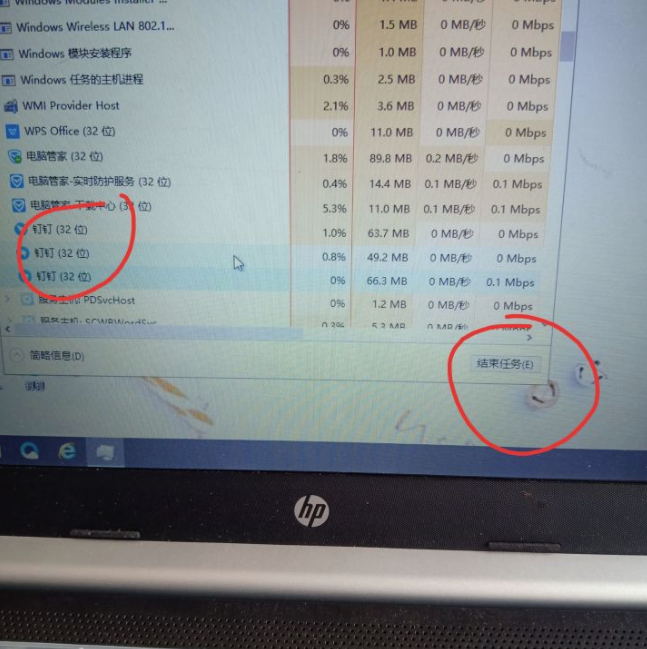 2.打开后,在任务管理器里选定钉钉,点结束任务。