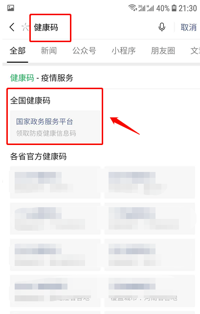 2.在搜索界面输入“健康码”关键词,在搜索结果中点击由国家政府服务平台提供的“全国健康码”。