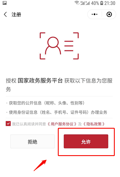 3.在授权国家政务服务平台页面点击“允许”,授权它使用自己的公开信息和身份信息。