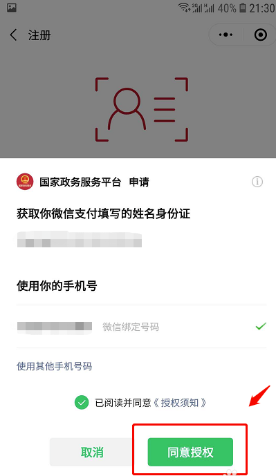 4.在弹出的国家政务服务平台,申请身份及手机信息页面,点击“同意授权”。