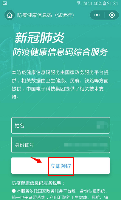 6.进入防疫健康信息码领取页面,点击“立即领取”,进行领取。