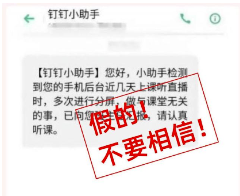 近日,有不少同学来问小钉,今天说说钉钉在线课堂直播分屏的事。因为网上有造谣者P图,说老师可以通过钉钉直播监控学生在电脑手机上分屏做什么。还有假冒钉钉发出的短信,声称可以后台监控。这些都是谣言,不要相信。同学们看仔细,这些图PS痕迹明显。对于此类谣言,同学们最好最快的验证方式是自己打开在线直播试试,就知道钉钉并不具备此类功能。我们再次严正声明:钉钉从来没有监控功能。对于恶意造谣者,我们将追究法律责任。