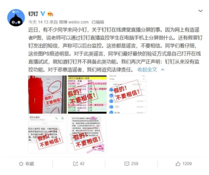 钉钉通过官方微博表示,近期网上有造谣者P图,说老师可以通过钉钉直播监控学生在电脑手机上分屏做什么;还有假冒钉钉发出的短信,声称可以后台监控。