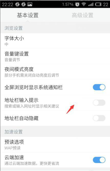 3、在基本设置中,把地址栏输入提示按钮打开就可以了;