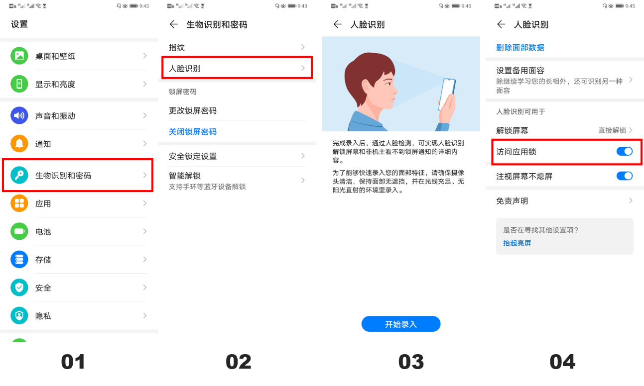 开启后,在使用被锁定的应用时,屏幕会首先出现“面部识别”或“指纹识别”的入口界面,当指纹或人脸信息核对无误后,用户方可进入该应用。