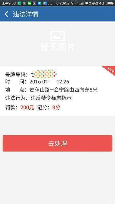 2、点击想要处理的违章条目,然后可以看到罚款和扣分,点击去处理可以进行处理操作。
