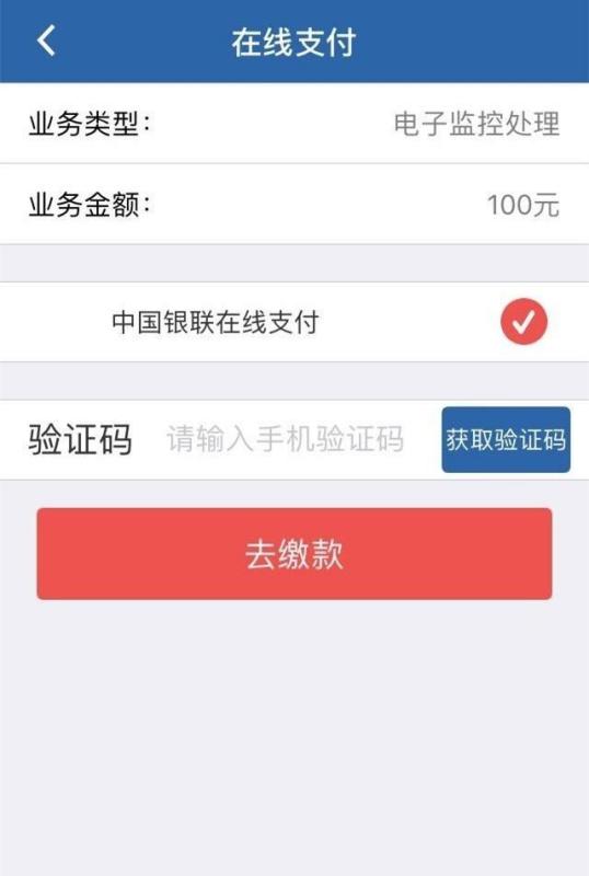 3、选择一个支付方式,再次获取验证码,验证码还是发送到交管12123APP绑定的手机号码上面,输入验证啊,点击去缴款,进行缴款操作。