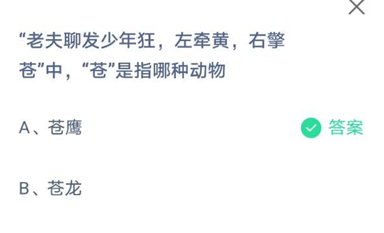 问题2:“老夫聊发少年狂,左牵黄,右擎苍”,中的“苍”是指哪种动物?