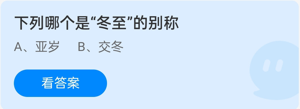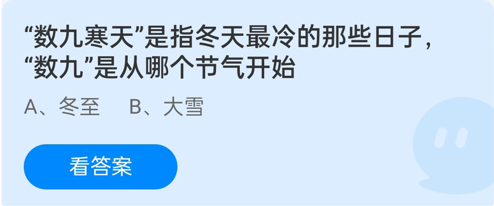 蚂蚁庄园12月21日的问题分别是:下列哪个是冬至的别称?数九寒天是指冬天最冷的那些日子,数九是从哪个节气开始?下面扒房网小编就为大家带来问题的解答,快来一起看看吧。
