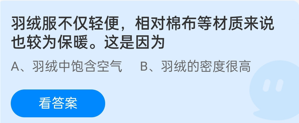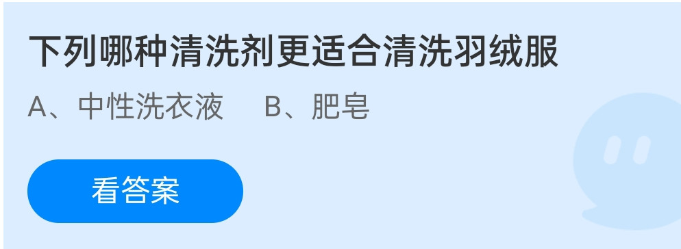 蚂蚁庄园12月22日的问题分别是:下列哪种清洗剂更适合清洗羽绒服?羽绒服不仅轻便,相对棉布等材质来说也较为保暖。这是因为?下面扒房网小编就为大家带来问题的解答,快来一起看看吧。