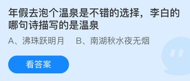 蚂蚁庄园1月23日的问题分别是:年假去泡个温泉是不错的选择,李白的哪句诗描写的是温泉?我国古人对温泉的开发利用不止泡澡,还包括以下哪一项?下面扒房网小编就为大家带来了这次的问题答案,不知道答案的小伙伴快来看看吧。
