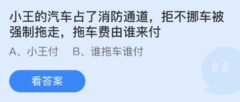 问题1:小王的汽车占了消防通道,拒不挪车被强制拖走,拖车费由谁来付?