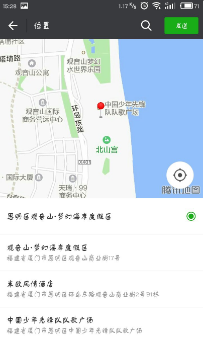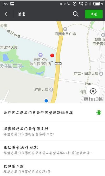 2、系统默认定位的你当前的位置,你可以选择移动地图来重新进行微信定位,然后点击:发送。