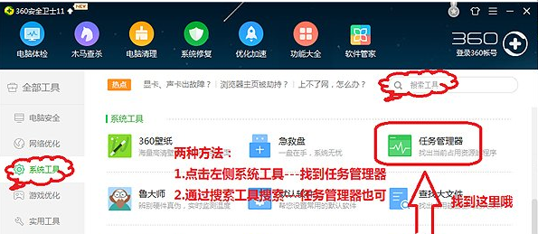 1、进入360工具箱主界面后,2种方法找到任务管理器,找到任务管理器后,点击即可。