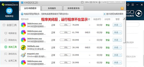 2、单击任务管理器后,360会自动添加小程序,在安装完成后便会自动打开任务管理器应用程序,在里面会列出当前后台运行程序及占用资源情况,还有在程序右侧管理下方,可选择关闭不需要运行的程序。