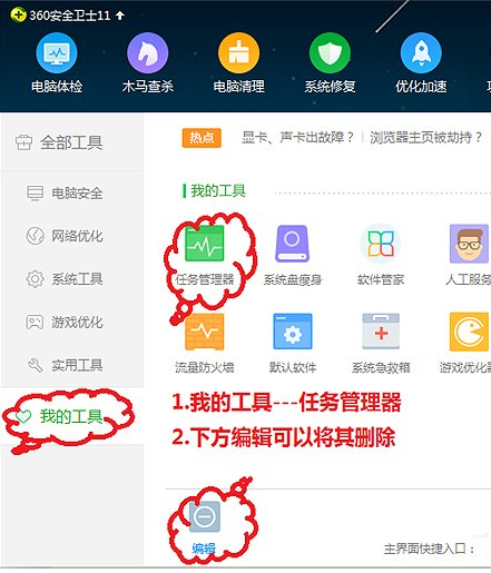 4、360任务管理器一旦添加就无需再次添加,可以按照步骤1,在“我的工具”里找到,下次直接在我的工具里使用即可,当然也可以通过编辑将其删除。