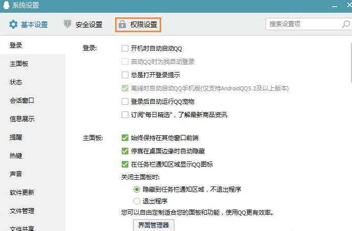 2、打开QQ系统设置窗口之后,我们点击顶端上的“权限设置”选项。