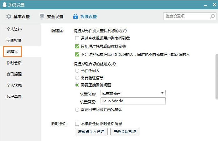 3、打开权限设置之后,我们点击设置窗口左边的“防骚扰”选项。