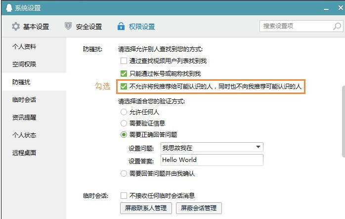 4、打开防骚扰选项之后,我们打钩“不允许将我推荐给可能认识的人,同时也不向我推荐可能认识的人” 。