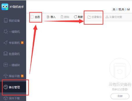 将iPhone设备和电脑进行连接,连接好后打开XY刷机助手,接着在XY刷机助手界面左侧的功能栏中打开“备份管理”,如下图所示:
