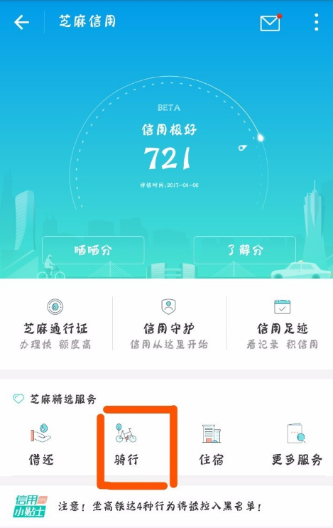 1、打开支付宝,进入个人中心页面,点击“芝麻信用”,点击“骑行”,如图。