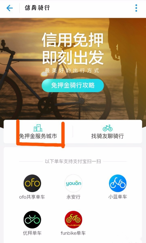 2、点击“免押金服务城市”,我们可以看见哪些车在我们生活的城市是可以信用骑行的,方便我们做出选择。