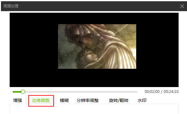 3、在“画面处理”界面的“边缘裁剪”中就可以裁剪视频了,通过调整上下左右边缘来裁剪视频,如下图所示: