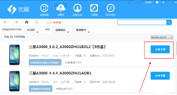3、找到后点击“本地下载”就可以将ROM包下载到电脑中了,在“我的ROM”中还可以查看已经下载的ROM包,如下图所示: