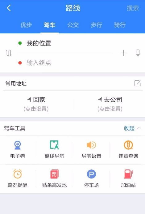 在搜索框内输入目的地后,点击屏幕右下角的“路线”(也可直接点路线),上方可以选择优步、驾车、公交、步行、骑行。