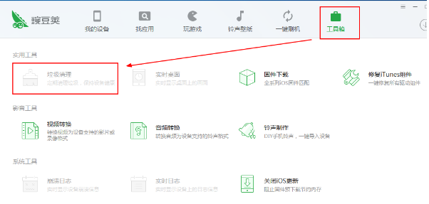 1、在电脑中打开豌豆荚,然后将手机和电脑进行连接。连接成功后在豌豆荚顶部的导航栏中打开“工具箱”,如下图所示: