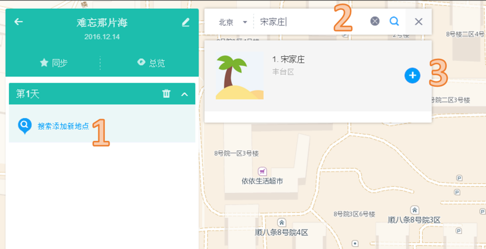 2、编辑路书在左侧面板中点击“搜索添加新地点”,之后在右侧的搜索框中依次添加当日的起点、途径点、终点。
