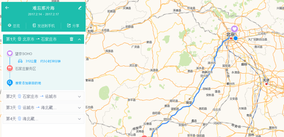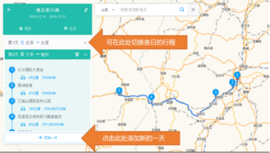 第一天的行程添加完毕后,点击添加一天,之后重复上述的步骤,添加新一天的起点、途径点、终点。
