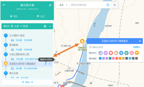 在编辑路书的过程中,可以在面板左侧点击“编辑地点图标”或在地图上点击图标,来编辑该地点的图标样式。