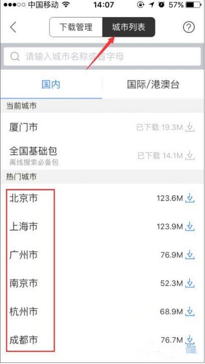 4、点击【城市列表】,下面会出现很多热门城市,大家可以根据需要选择下载,在城市右侧有蓝色下载按钮;