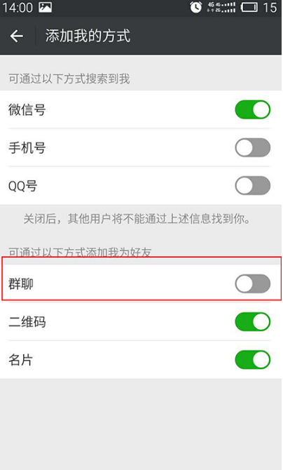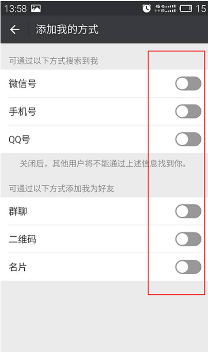 2、对方关闭了部分添加我的方式,微信提供了多种添加好友的方式,比如,通过手机号、微信号、QQ号、群聊、二维码、名片,如果以上添加我的方式都关闭了,就算拿到正确的手机号、微信号等信息,也添加不了对方。