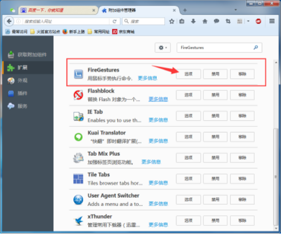 3、安装完毕后在扩展里找到FireGestures插件,然后点击“选项”按钮;