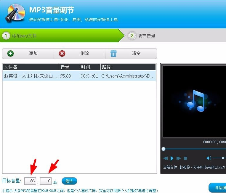 3、之后在下边的“目标音量”中通过调整db值来设置音量的大小,点击调整按钮即可;另外我们还可以在右边的窗口中进行试听