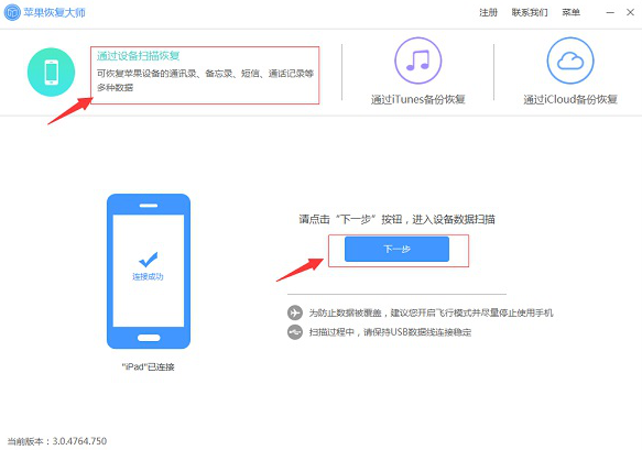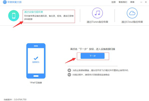2、根据苹果恢复大师的界面提示,我们选择默认模式“通过设备扫描恢复”。